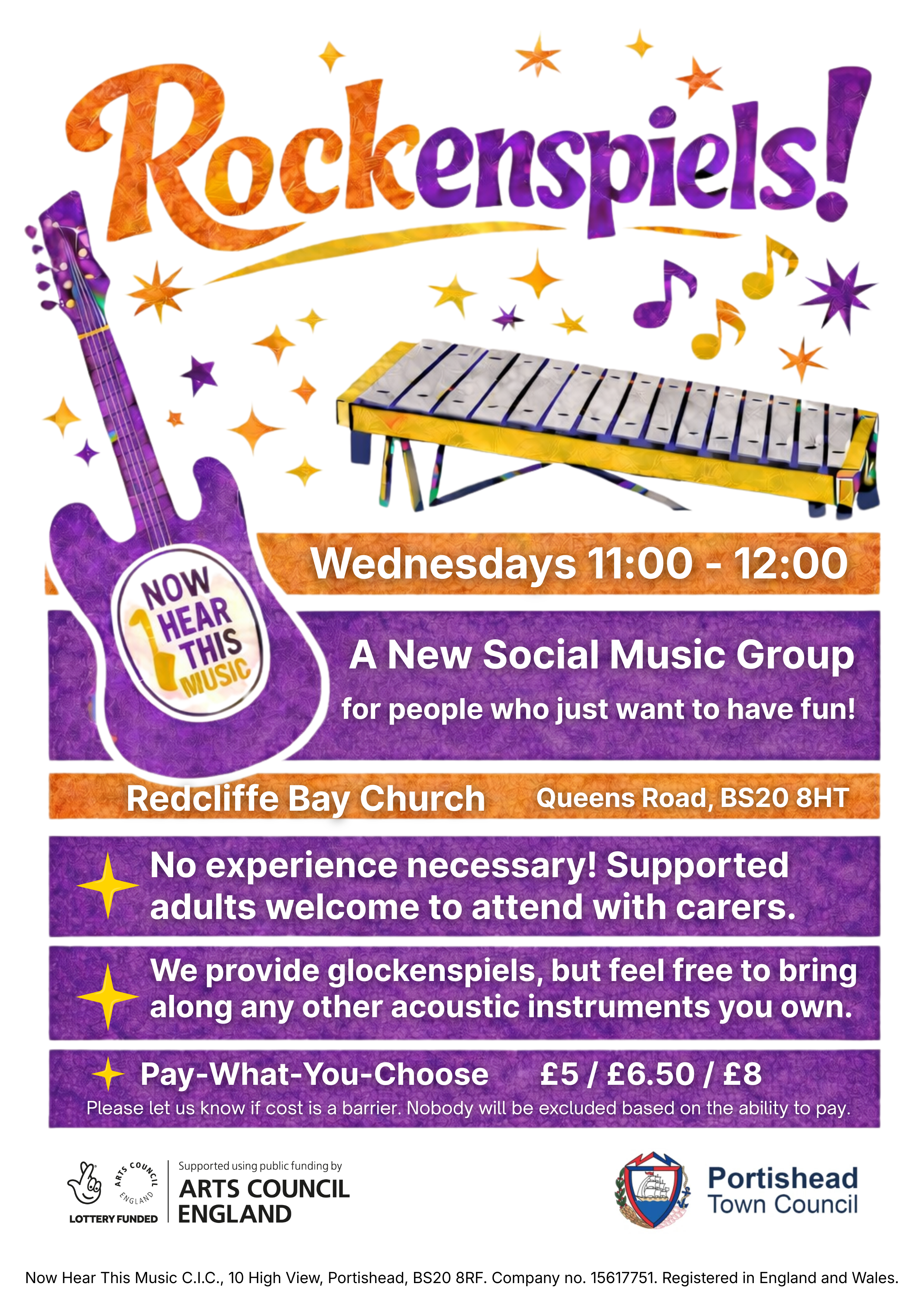 Thanks to generous funding support from Arts Council England and Portishead Town Council we are able to run a Pay-What-You-Choose offer for this group, as well as offer fully funded spaces for those who would otherwise find cost to be a barrier to participation.